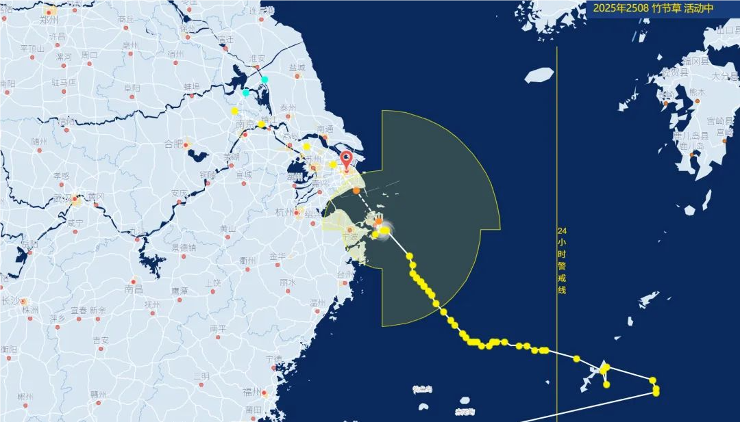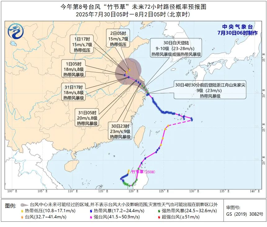中央气象台发布消息,今年第8号台风“竹节草”(热带风暴级)的中心已于今天(30日)早晨4时30分前后在浙江省舟山市朱家尖岛沿海登陆,登陆时中心附近最大风力有9级(23米/秒),中心最低气压为975百帕。