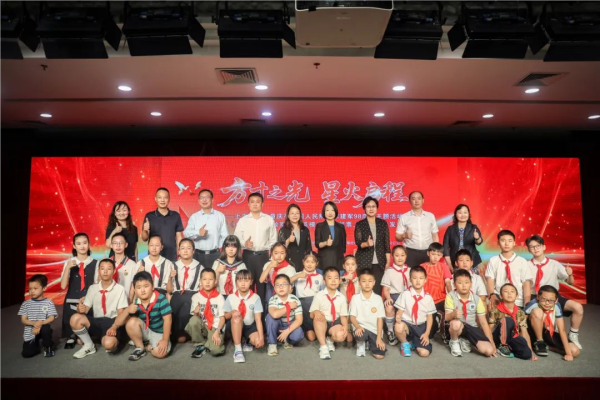 虹口区退役军人事务局与中福会少年宫相关领导共同为亲子家庭代表传递能量包。