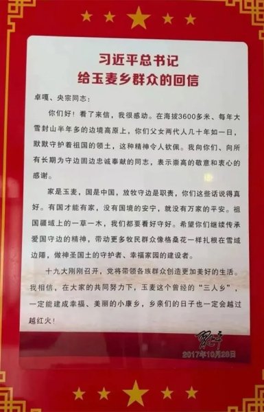 跟随卓嘎的脚步,采访组走进玉麦乡政府,在左边墙上的大幅展框里,是习近平总书记给玉麦乡群众的回信,“祖国疆域上的一草一木,我们都要看好守好。希望你们继续传承爱国守边的精神,带动更多牧民群众像格桑花一样扎根在雪域边陲,做神圣国土的守护者、幸福家园的建设者”。