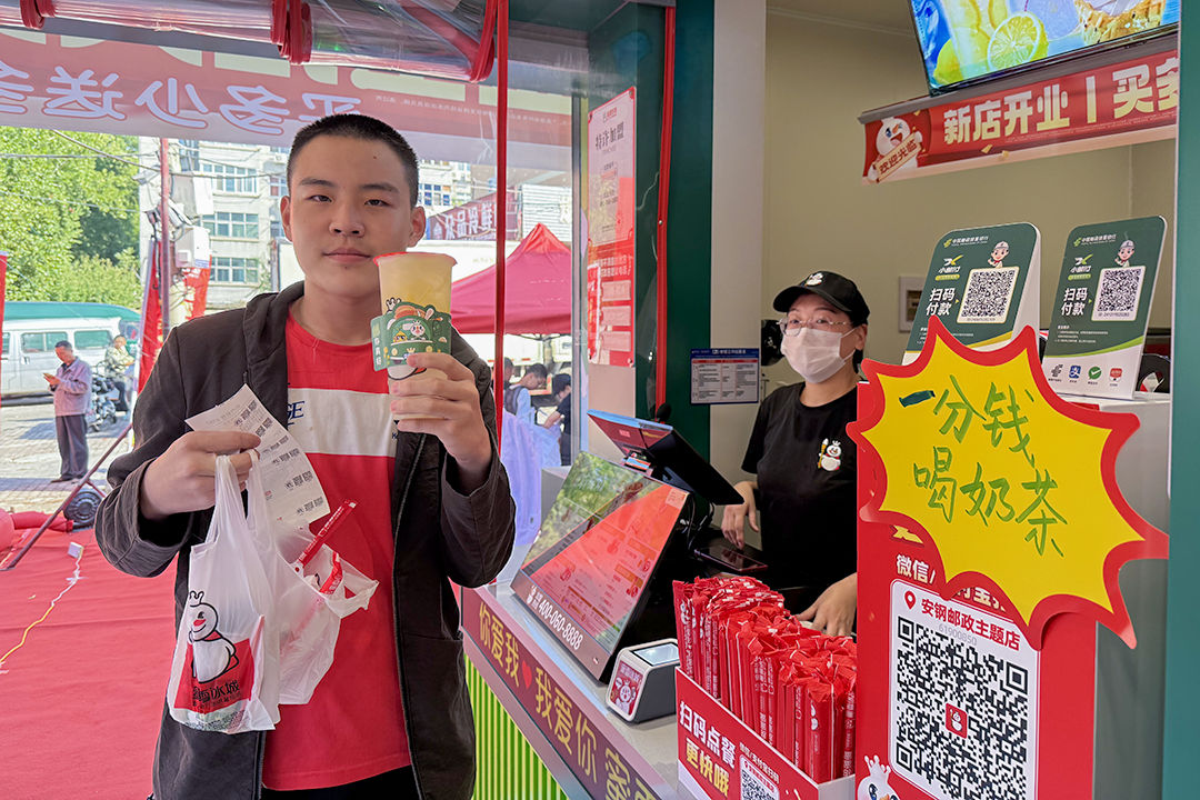 为了庆祝联名店开业,当天,安阳市邮政分公司推出了“一分购”喝奶茶活动,前来邮政营业厅办理业务的客户,只需花一分钱就可以解锁一杯香甜的茶饮。