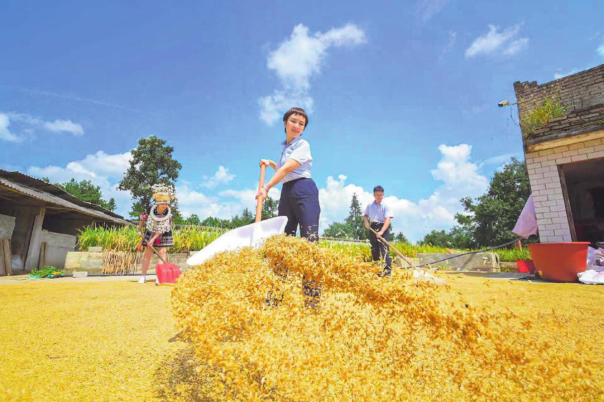 邮储银行贵州省分行党委立足地方实际,深入推动党业融合,充分发挥产品与服务优势,今年以来累计投放超100亿元信贷资金,助力贵州推动乡村振兴战略深入实施和加快构建现代粮食产业体系,实现以金融之力护航地方“盈粮满仓”。图为黔东南苗族侗族自治州分行党员志愿者日前与农户一同晒稻谷,共享“秋收万颗子”的喜悦。