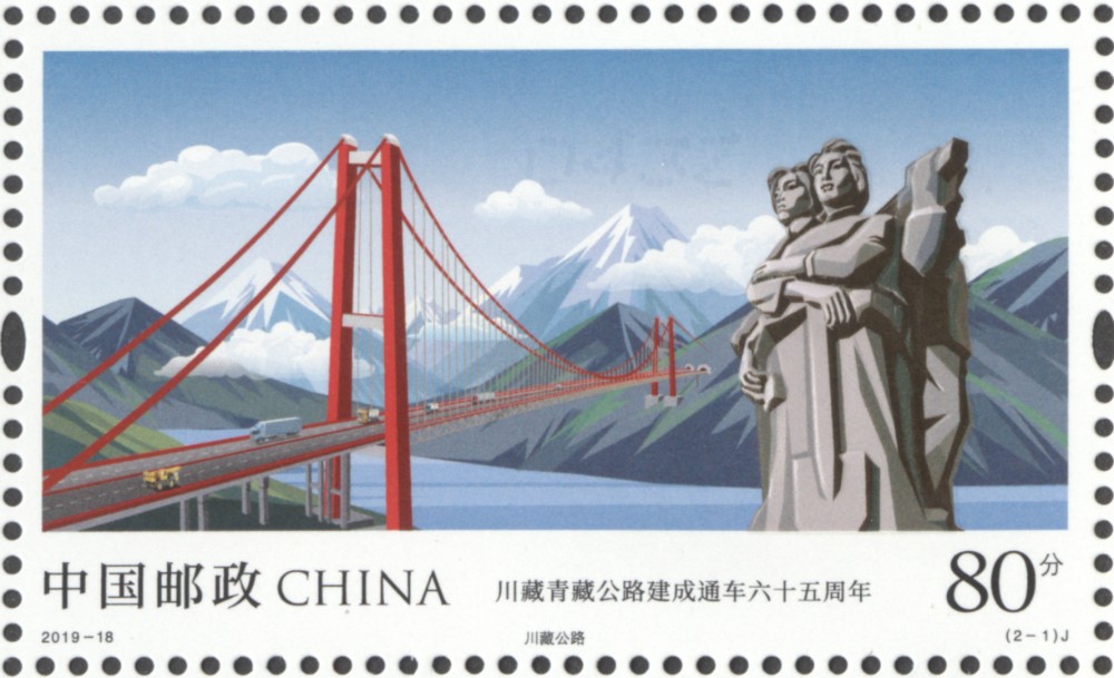 中国邮政定于2019年8月10日发行《川藏青藏公路建成通车六十五周年》纪念邮票1套2枚,邮票图案名称分别为:川藏公路、青藏公路,全套邮票面值为2元。