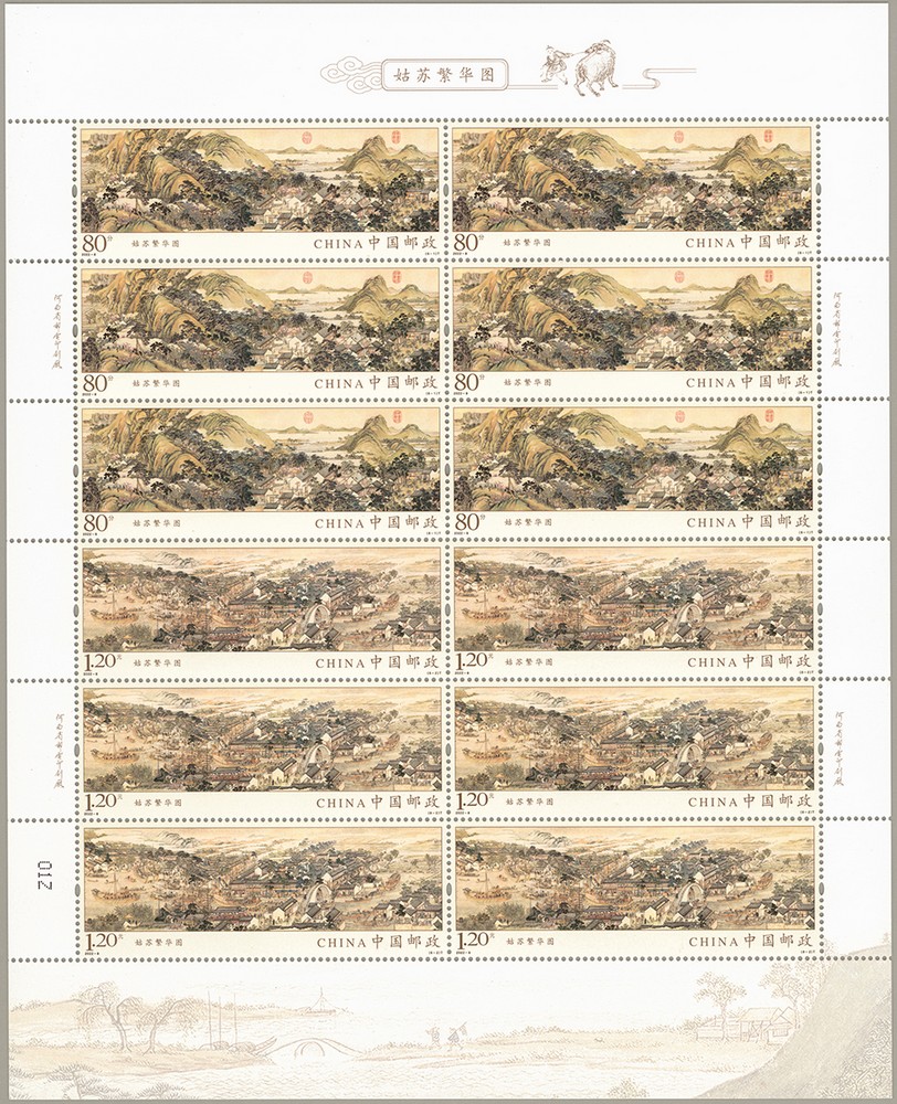 该套邮票由邢文伟设计,按照画卷中景点的路线与所绘内容,重点表现了灵岩山、木渎镇、狮何二山、万年桥、阊门、虎丘6段画面内容。邮票采用横长票幅,充分展现了古画精谨细微又壮阔宏大的盛世景象。整体设计古朴典雅,充分还原原画的意境,呈现独特的视觉艺术效果。